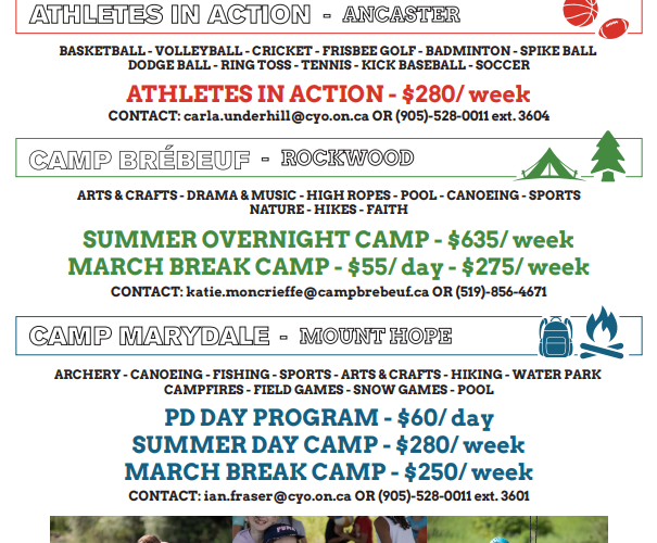 C.Y.O. 2026 program registration is now open, this includes PD Day camps, March Break camps, and summer camps at Camp Marydale (Mount Hope), Camp Brébeuf (Rockwood ON) and Athletes in Action (Ancaster). More info and contact for each camp is available at www.cyo.on.ca !  Â