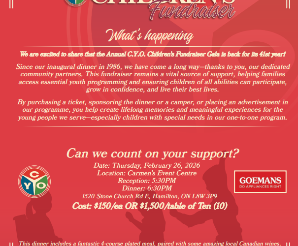 The 41st Annual C.Y.O. Children’s Fundraiser Dinner will take place on Thursday, February 26th at Carmen’s Event Centre. This vital fundraiser helps offset the costs of our one-to-one counsellor program for children living with special needs. Support can be shown through ticket purchases, event sponsorship, program advertisements, or sponsoring a campership for a family facing financial hardship. Contact anthony.oleszek@cyo.on.ca for more info!